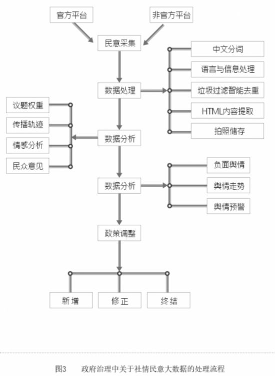 在大數(shù)據(jù)時(shí)代的背景下,各地紛紛展開(kāi)試驗(yàn)。2014年10月,惠州市提出要運(yùn)用現(xiàn)代信息技術(shù)等手段,深度整合網(wǎng)絡(luò)問(wèn)政、“惠民在線”論壇、“向書(shū)記說(shuō)說(shuō)心里話(huà)”等平臺(tái)資源,建立“惠州社情民意信息庫(kù)”;2015年3月,佛山市南海區(qū)打造工會(huì)移動(dòng)APP服務(wù)平臺(tái),收集基層工會(huì)和職工關(guān)心的熱點(diǎn)話(huà)題;2016年2月,廣西壯族自治區(qū)提出要運(yùn)用信訪大數(shù)據(jù),開(kāi)展社情民意綜合分析;2016年5月,山東省政協(xié)聯(lián)合濟(jì)南市12345市民服務(wù)熱線和IT企業(yè)共建社情民意大數(shù)據(jù)共享和分析平臺(tái),嘗試用大數(shù)據(jù)技術(shù)來(lái)關(guān)注民生、分析民意、研究熱點(diǎn);等等。根據(jù)地方政府經(jīng)驗(yàn),現(xiàn)將通用的手段和程序歸納整理為圖3。