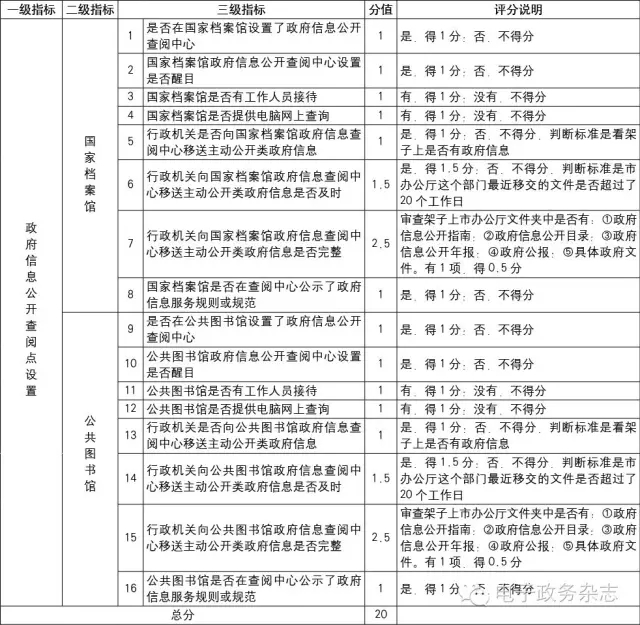 《政府信息公開條例》第十六條要求各級行政機關向檔案館和公共圖書館及時提供應該主動公開的政府信息。該條規(guī)定:各級人民政府應當在國家檔案館、公共圖書館設置政府信息查閱場所,并配備相應的設施、設備,為公民、法人或者其他組織獲取政府信息提供便利。行政機關可以根據(jù)需要設立公共查閱室、資料索取點、信息公告欄、電子信息屏等場所和設施,以公開政府信息。行政機關應當及時向國家檔案館、公共圖書館提供主動公開的政府信息。該條對向誰提供、提供什么信息、提供的時間要求等做了規(guī)定,構成了我們評估指標設計的基礎。