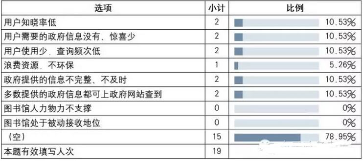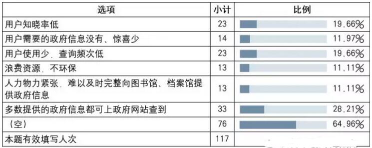 也有部分圖書館工作人員認為沒有必要繼續(xù)設置(參見表7)。主要是覺得用戶知曉率低;用戶需要的政府信息沒有、驚喜少;用戶使用少,查詢頻次低;政府提供的信息不完整、不及時;多數(shù)提供的政府信息都可上政府網(wǎng)站查到;浪費資源,不環(huán)保等。和檔案館不同,人力物力不是圖書館主要考慮的制約因素。