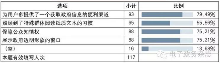 政府信息公開工作人員認為有必要繼續(xù)設置的理由(參見表16),主要是為用戶多提供了一個獲取政府信息的便利渠道,在保障公眾知情權基礎上,起到展示政府透明形象的積極作用。同時,還照顧到了特殊群體閱讀紙質(zhì)文本的習慣。