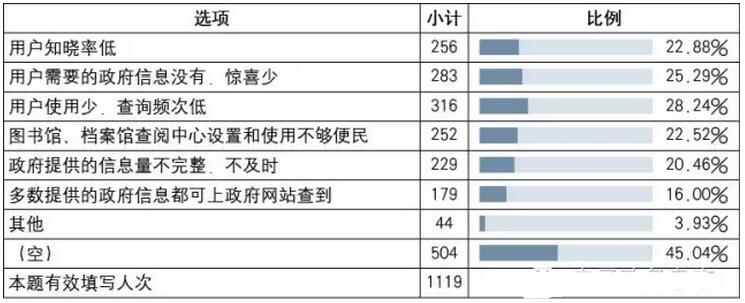 政府信息公開工作人員認為沒有必要繼續(xù)設置的理由(參見表17),主要是多數(shù)提供的政府信息都可上政府網(wǎng)站查到,加上用戶知曉率低所帶來的用戶使用率低和導致的資源浪費因素。政府部門自身的因素則包括人力物力緊張,難以及時完整向圖書館、檔案館提供政府信息,加上用戶需要的政府信息提供難。要充分發(fā)揮查閱中心作用,還有不少挑戰(zhàn)。