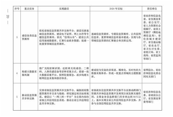 (三)總體目標(biāo)。到2020年,初步形成發(fā)展氛圍濃厚、體制機(jī)制較完善、共享開放程度較高、創(chuàng)新應(yīng)用范圍較廣的大數(shù)據(jù)發(fā)展格局,大數(shù)據(jù)成為提升政府治理能力、推動經(jīng)濟(jì)轉(zhuǎn)型升級、塑造山東競爭新優(yōu)勢的戰(zhàn)略路徑。