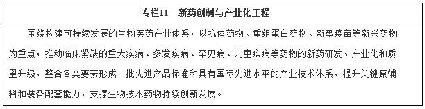 (一)構(gòu)建生物醫(yī)藥新體系。加快開發(fā)具有重大臨床需求的創(chuàng)新藥物和生物制品,加快推廣綠色化、智能化制藥生產(chǎn)技術(shù),強化科學(xué)高效監(jiān)管和政策支持,推動產(chǎn)業(yè)國際化發(fā)展,加快建設(shè)生物醫(yī)藥強國。