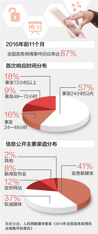 人民網新媒體智庫分析顯示,2016年1月—11月的600多起輿情案例中,政府回應率達到87%,有57%以上的事件政府首次響應在事發(fā)24小時之內,有73%的事件政府部門首次回應在48小時之內(含24小時)。其中,41%的事件通過政務新媒體作出回應(右圖)。