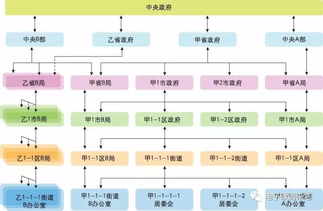 A類(lèi)共享需要“跨地域橫向共享平臺(tái)+跨部門(mén)橫向共享平臺(tái)+部門(mén)內(nèi)跨層級(jí)縱向共享平臺(tái)”才能實(shí)現(xiàn)。在本事例中,需要在江西的街道派出所和北京旅游局之間實(shí)現(xiàn)信息共享,如圖1所示,相當(dāng)于“乙1-1-1街道B辦公室”的信息要達(dá)到“甲省A局”,其可能的路徑有多條,以通過(guò)政府機(jī)構(gòu)數(shù)量為依據(jù),最短的三條路徑是:①乙1-1-1街道B辦公室→乙1-1區(qū)B局→乙1市B局→乙省B局→中央B部→省B局→甲省政府→甲省A局;②乙1-1-1街道B辦公室→乙1-1區(qū)B局→乙1市B局→乙省B局→中央B部→中央政府→中央A部→甲省A局;③乙1-1-1街道B辦公室→乙1-1區(qū)B局→乙1市B局→乙省B局→乙省政府→中央政府→甲省政府→甲省A局。這三條路徑都可以實(shí)現(xiàn)兩部門(mén)間信息共享。