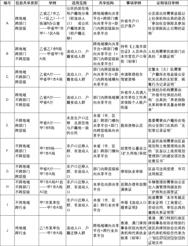 下面以上海市市民辦事項(xiàng)目為樣本,分別從適用范圍、共享結(jié)構(gòu)、共享難度、事項(xiàng)舉例四方面,對(duì)10類(lèi)信息共享進(jìn)行說(shuō)明(參見(jiàn)表1)。