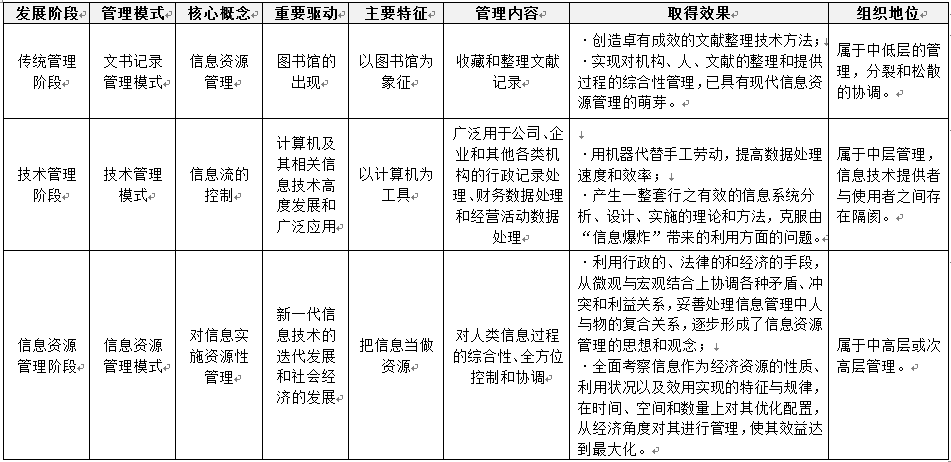 然而,這一理論在中國(guó)一直沒(méi)有得到良好的實(shí)踐支撐。從歷史和全局的發(fā)展角度看,信息資源管理已經(jīng)經(jīng)歷了三個(gè)發(fā)展階段,從文書(shū)記錄的傳統(tǒng)管理模式,到依托計(jì)算機(jī)的技術(shù)管理模式,再到目前的信息資源管理模式,下表圍繞核心概念、重要驅(qū)動(dòng)、主要特征、管理內(nèi)容、組織地位等對(duì)不同階段的管理模式做了簡(jiǎn)單的對(duì)比分析??梢园l(fā)現(xiàn),不同時(shí)期的管理模式都是適應(yīng)時(shí)代發(fā)展的要求而出現(xiàn)的,信息作為一種資源,在當(dāng)時(shí)都發(fā)揮了積極的作用。但是從其本身所蘊(yùn)含的價(jià)值來(lái)看,其作為一種生產(chǎn)要素或經(jīng)濟(jì)要素的價(jià)值還遠(yuǎn)遠(yuǎn)沒(méi)有被開(kāi)發(fā)出來(lái),這也就是為什么大多數(shù)人還沒(méi)有建立起對(duì)信息資源應(yīng)有的認(rèn)識(shí)。