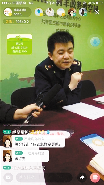 據(jù)介紹,這場由本報直播團隊和青羊區(qū)共同舉辦的政務(wù)服務(wù)網(wǎng)絡(luò)直播活動在我市尚屬首次,在近50分鐘的直播時間里,累計吸引了9000余人次在線觀看,青羊區(qū)市場監(jiān)管局、青羊區(qū)衛(wèi)計局相關(guān)窗口首席代表在線解答網(wǎng)友提問6個,通過網(wǎng)絡(luò)直播的手段,實時在線與網(wǎng)友互動。