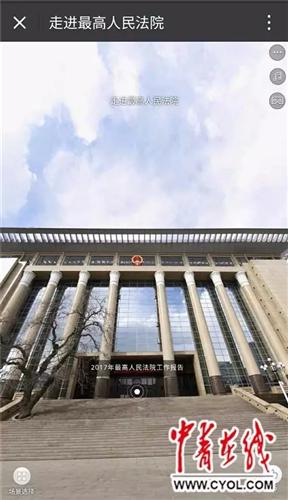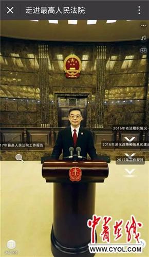 一經(jīng)掃描,頁(yè)面即彈出最高人民法院主建筑畫(huà)面,滑動(dòng)屏幕,還可360度旋轉(zhuǎn)看到院內(nèi)的大門(mén)、綠化帶等場(chǎng)景。 VR中的主建筑正門(mén)處,有一個(gè)“2017年最高人民法工作報(bào)告”的圓點(diǎn)。點(diǎn)擊后,映入眼簾的是最高人民法院院長(zhǎng)周強(qiáng)站在發(fā)言臺(tái)前的圖像。 提到最高法加強(qiáng)庭審公開(kāi)的時(shí)候,他說(shuō)了一組數(shù)據(jù):自去年7月1日起,所有公開(kāi)開(kāi)庭案件都上網(wǎng)直播,各級(jí)法院直播庭審62.5萬(wàn)次,觀看量達(dá)到20.7億人次。