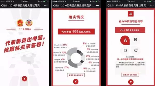 《最高人民檢察院工作報(bào)告》首頁(yè)上同樣出現(xiàn)了二維碼,掃描后的頁(yè)面中有輕快的背景音樂(lè)配合活潑的動(dòng)畫(huà),通過(guò)一組組數(shù)據(jù)和案例,從維穩(wěn)、經(jīng)濟(jì)、反腐、司法公正等7個(gè)方面,體現(xiàn)了2016年檢察機(jī)關(guān)的工作成果,還包括2017年檢察機(jī)關(guān)工作計(jì)劃 除此之外,還有一個(gè)互動(dòng)性的H5《代表委員出題,檢察機(jī)關(guān)來(lái)答卷》。