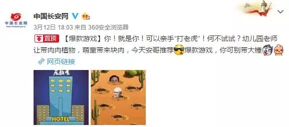 是不是看到了熟悉的“大老虎”?不過(guò)要小心,別誤傷了包大人。 媒記君打到了40只“老虎”。在結(jié)束頁(yè)面上,出現(xiàn)了“兩高報(bào)告”的鏈接,這套路真是深啊…… 在微博上,@中國(guó)長(zhǎng)安網(wǎng)(微博認(rèn)證為:中共中央政法委員會(huì)、中央社會(huì)治安綜合治理委員會(huì)官方新聞網(wǎng)站)置頂推薦了這個(gè)H5小游戲。
