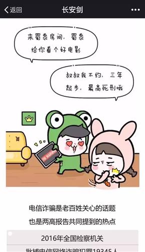 除了互動(dòng)小游戲,“長(zhǎng)安劍”還與“蛙哥漫畫(huà)”合作,推出了《3分鐘讓你看懂“兩高報(bào)告”》(看到這個(gè)題目,是不是想到了谷阿莫的《x分鐘看完xxx》系列?),用軟萌的畫(huà)風(fēng)、活潑的對(duì)話(huà)把“兩高報(bào)告”中的重點(diǎn)內(nèi)容傳達(dá)了出來(lái)。