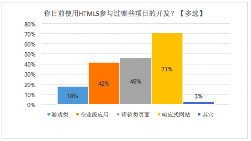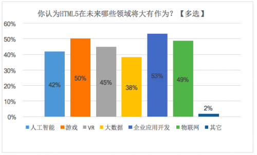 與此同時,53%的人認(rèn)為HTML5將最有可能在企業(yè)級應(yīng)用領(lǐng)域得到廣泛應(yīng)用,這一比例超過物聯(lián)網(wǎng)、游戲,VR等。整體而言,開發(fā)者都對HTML5在未來的應(yīng)用前景持非常樂觀的態(tài)度。
