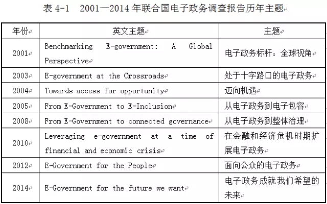 《聯(lián)合國電子政務(wù)調(diào)查報(bào)告》由聯(lián)合國社會和經(jīng)濟(jì)事務(wù)部每年推出,是世界上唯一一份評價(jià)193個(gè)聯(lián)合國成員國電子政務(wù)發(fā)展?fàn)顩r的研究報(bào)告,是決策者了解本國電子政務(wù)優(yōu)勢和不足從而制定有效策略的工具。報(bào)告通過排名為各成員國的電子政務(wù)發(fā)展?fàn)顩r提供了一個(gè)快照,成為評估公共行政部門電子政務(wù)服務(wù)水準(zhǔn)的權(quán)威標(biāo)桿。自2001—2014年的十四年間,聯(lián)合國針對全球電子政務(wù)發(fā)展?fàn)顩r發(fā)布了8份調(diào)查報(bào)告。每一期都緊隨時(shí)代的潮流,與電子政務(wù)的發(fā)展現(xiàn)狀緊密相連,每年都從全球電子政務(wù)發(fā)展所面對的共性問題中提煉出評估主題,并盡可能通過年度調(diào)查的主題中體現(xiàn)出來(見表4-1)。