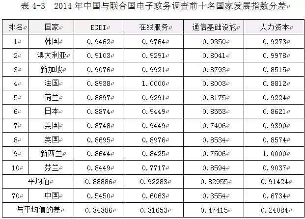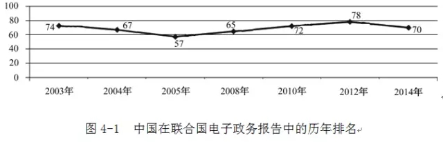 通過圖4-1可清晰地看到,中國在全世界范圍內(nèi)的電子政務(wù)發(fā)展水平從2003—2014年呈現(xiàn)輕微波動的趨勢,從2005—2012年,中國的電子政務(wù)排名呈持續(xù)下滑態(tài)勢,2014年為近十年來首次上升。因此,盡管中國電子政務(wù)在投入、政策等方面持續(xù)發(fā)力,但中國電子政務(wù)在全球范圍內(nèi)并沒有呈現(xiàn)出跨越式的進(jìn)步。