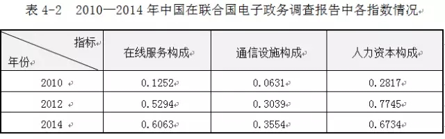 通過近三屆《聯(lián)合國電子政務(wù)調(diào)查報(bào)告》數(shù)據(jù)顯示,2012年中國電子政務(wù)在在線服務(wù)與人力資本方面有較大的提升,但是中國在聯(lián)合國報(bào)告排名中相較于2010年的第72名下降6名,說明中國電子政務(wù)發(fā)展雖然取得了一定的進(jìn)步,但是相對于世界各國的發(fā)展速度仍相對緩慢。2014年,中國電子政務(wù)人力資本構(gòu)成指數(shù)有所下降,在線服務(wù)與通信基礎(chǔ)設(shè)施指數(shù)弱微上升(見表4-2)。