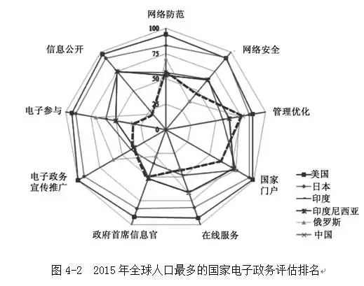 從早稻田大學(xué)發(fā)布的2015年國際電子政務(wù)排名調(diào)查結(jié)果來看,評估范圍僅選取了信息通信技術(shù)水平相對較高的63個(gè)國家,前十名國家與聯(lián)合國電子政務(wù)調(diào)查報(bào)告存在一定的出入,但中國電子政務(wù)排名僅位列49名,得分為48.36。假如大家認(rèn)為新加坡、韓國、丹麥、挪威等國家由于國土面積、人口、發(fā)展基礎(chǔ)等方面原因具有先天的發(fā)展優(yōu)勢,那么可以再看看“全球人口最多的10個(gè)國家”的電子政務(wù)發(fā)展?fàn)顩r(見圖4-2)。