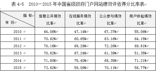 在聯(lián)合國的全球電子政務(wù)調(diào)查當(dāng)中,國家政府門戶網(wǎng)站的建設(shè)水平分別作為“在線服務(wù)指數(shù)”的評價(jià)內(nèi)容之一,在早稻田大學(xué)的國際電子政務(wù)評估中,國家政府門戶網(wǎng)站則作為其中的一個(gè)一級指標(biāo)體現(xiàn)。由此可見,政府網(wǎng)站的建設(shè)歷來就是電子政務(wù)發(fā)展水平的重要部分,不僅體現(xiàn)政府對互聯(lián)網(wǎng)的接納度與利用能力,同時(shí)也直接反應(yīng)互聯(lián)網(wǎng)時(shí)代政府的信息服務(wù)水平。自2009年開始,國脈互聯(lián)政府網(wǎng)站評測研究中心與中國社會科學(xué)院信息化研究中心聯(lián)合開展全國政府網(wǎng)站績效評估,指標(biāo)設(shè)計(jì)以用戶為中心,明確不同層級的政府網(wǎng)站功能定位和發(fā)展重點(diǎn),客觀反映政府網(wǎng)站發(fā)展水平,突出政府網(wǎng)站服務(wù)導(dǎo)向和應(yīng)用實(shí)效。指標(biāo)體系主要包括四方面內(nèi)容,即“信息公開、在線服務(wù)、公眾參與、用戶體驗(yàn)”,評估范圍包括74個(gè)部委(國務(wù)院組成部門25個(gè)、國務(wù)院直屬特設(shè)機(jī)構(gòu)1個(gè)、國務(wù)院直屬機(jī)構(gòu)15個(gè)、國務(wù)院辦事機(jī)構(gòu)4個(gè)、國務(wù)院直屬事業(yè)單位13個(gè)、國務(wù)院部委管理的國家局16個(gè))、31個(gè)?。ㄖ陛犑?、自治區(qū))、32個(gè)省會及計(jì)劃單列市、301個(gè)地市、全國政務(wù)公開和政務(wù)服務(wù)試點(diǎn)縣(市、區(qū))100個(gè)及自報(bào)名縣(市、區(qū))(見表4-5)。