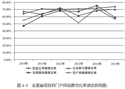 由于每年評估體系的指標(biāo)權(quán)重不同,所以我們采用各項(xiàng)指標(biāo)得分比率來分析我國省級政府門戶網(wǎng)站績效評估得分在過去五年的變動情況。從2010—2015年全國省級政府門戶網(wǎng)站績效評估在信息公開、在線服務(wù)、公眾參與、用戶體驗(yàn)方面的績效評分得分比率可以看出,信息公開、公眾參與均體現(xiàn)持續(xù)上升趨勢,這是政府信息公開的政策性要求與移動社交媒體發(fā)展的必然結(jié)果,在政府網(wǎng)站發(fā)布政府信息已成為常態(tài),通過政府網(wǎng)站、微信、微博等與政府機(jī)構(gòu)進(jìn)行溝通漸成趨勢。而在線服務(wù)與用戶體驗(yàn)在2015年的整體得分率則呈現(xiàn)持續(xù)下滑趨勢,如果對照當(dāng)下互聯(lián)網(wǎng)技術(shù)演進(jìn)形勢,我們可以發(fā)現(xiàn),通過微信、微博等第三方平臺優(yōu)化政府在線服務(wù)能力、提升用戶體驗(yàn)正是在2015年走向全盛時(shí)期,從單純的信息公開和互動交流需求走向政務(wù)服務(wù)。因此,國脈互聯(lián)政府網(wǎng)站評測研究中心以“政府網(wǎng)站+”為理念,將政府網(wǎng)站的“在線服務(wù)”與“用戶體驗(yàn)”承載范疇拓展到在微信、微信城市服務(wù)、微博等平臺,從這個(gè)角度來看,整體得分率的下滑也暗示部分政府網(wǎng)站尚未跟上步伐(見圖4-3)。