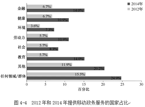 據(jù)《2012年聯(lián)合國電子政務(wù)調(diào)查報(bào)告》顯示,在對193個(gè)聯(lián)合國成員國政府門戶網(wǎng)站使用社交網(wǎng)絡(luò)情況的調(diào)查結(jié)果表明,其中78個(gè)成員國(40%)的政府官方網(wǎng)站上有這樣的聲明“可以通過Facebook或Twitter與我們聯(lián)系”。調(diào)查數(shù)據(jù)還表明,有14個(gè)政府官方網(wǎng)站(7%)通過聊天室或即時(shí)消息的手段來獲取最直接(沒有經(jīng)過整理的)的公眾意見[1]?!?014年聯(lián)合國電子政務(wù)調(diào)查報(bào)告》顯示,提供移動應(yīng)用和移動門戶的國家數(shù)量,從2012—2014 年翻了一番。2014 年,27 個(gè)國家(14%)在教育領(lǐng)域提供移動服務(wù),而2012 年僅有11 個(gè)國家(5.7%);2014 年,14 個(gè)國家(7.3%)在環(huán)境領(lǐng)域提供移動服務(wù),而2012 年僅有7 個(gè)國家(3.6%)。2012 年,25 個(gè)國家擁有移動門戶,2014 年增加到48 個(gè)。然而,這一趨勢離飽和狀態(tài)還差很遠(yuǎn),尤其是在縮小貧困和弱勢群體的數(shù)字化差距上(見圖4-4)。