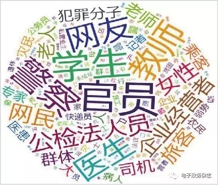 根據(jù)有關(guān)文件,我們將公共輿情事件的類型總體分為自然災(zāi)害、改革政策、吏治反腐、公共安全、公安司法、社會治理、教育領(lǐng)域、交通運輸、醫(yī)療衛(wèi)生、環(huán)境保護(hù)、違法犯罪、旅游領(lǐng)域、企業(yè)事件、社會倫理、軍事領(lǐng)域、涉外事件等20個類型。通過對2016年1-11月熱點輿情事件進(jìn)行統(tǒng)計,發(fā)現(xiàn)社會治理、公共安全、教育領(lǐng)域、公安司法以及吏治反腐等領(lǐng)域輿情事件數(shù)量在整體上排名前五,受關(guān)注度也較高。特別是社會治理領(lǐng)域,全國共發(fā)生141起輿情事件,占全年輿情總數(shù)的21.8%。從輿情事件涉及的職業(yè)群體來看,官員、教師、警察、醫(yī)生、學(xué)生等成為2016年輿情事件的高頻詞,也在一定程度上反映出公共輿情事件的群體標(biāo)簽屬性(參見圖2、圖3)。