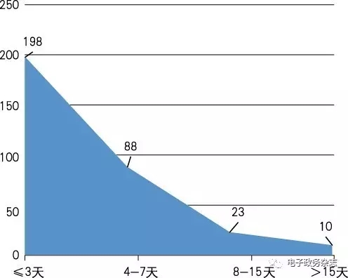 從輿情事件的傳播周期分布情況來看,輿情周期在3天之內(nèi)的事件較多,占總樣本的62%;傳播周期在4-7天的輿情事件占28%?;ヂ?lián)網(wǎng)時代信息交替較快,議題討論持續(xù)時間較短,不斷有新的輿情事件進(jìn)入公眾視野,故90%的事件傳播周期在一周以內(nèi)。也有部分事件在傳播過程中持續(xù)曝出新進(jìn)展,如“雷洋案”“賈敬龍案”“韓春雨事件”“網(wǎng)約車新政”等受網(wǎng)友持續(xù)關(guān)注,但97%的事件傳播周期都在15天之內(nèi)(參見圖6)。