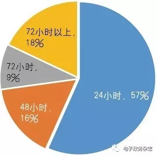 自2016年以來,我國公共部門面對突發(fā)性輿情的響應(yīng)速度顯著提升,對輿情早期傳播的預(yù)警、干預(yù)能力也有較大的提高。在統(tǒng)計的646起政務(wù)輿情案例中,政府回應(yīng)率達(dá)到87%,有超過57%以上的事件政府首次響應(yīng)在事發(fā)24小時之內(nèi),有73%的事件政府部門在48小時之內(nèi)(含24小時)做出了首次回應(yīng)(參見圖7)。