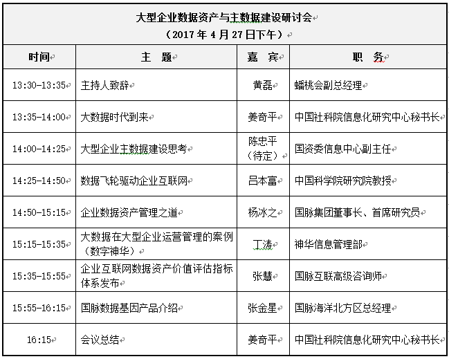 為快速推進我國企業(yè)互聯(lián)網(wǎng)數(shù)據(jù)資產(chǎn)的建設(shè)與發(fā)展,科學(xué)評價中國智慧企業(yè)互聯(lián)網(wǎng)競爭力,推動互聯(lián)網(wǎng)和實體經(jīng)濟深度融合,由中國社會科學(xué)院信息化研究中心指導(dǎo),北京國脈互聯(lián)信息顧問有限公司、北京銘世博國際展覽有限公司聯(lián)合主辦,國脈海洋信息發(fā)展有限公司、浙江蟠桃會網(wǎng)絡(luò)技術(shù)有限公司承辦的“大型企業(yè)數(shù)據(jù)資產(chǎn)與主數(shù)據(jù)建設(shè)研討會”將于2017年4月27號在中國國際展覽中心召開,邀請國內(nèi)相關(guān)領(lǐng)導(dǎo)、知名專家和企業(yè)高管等展開深入探討。