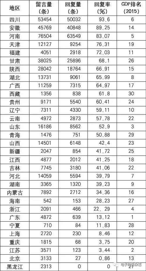 表3 人民網(wǎng)地方領(lǐng)導(dǎo)留言板留言量、回復(fù)量、回復(fù)率及GDP統(tǒng)計[21]