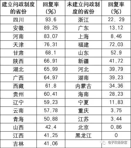 從表5統(tǒng)計可見,建立問政制度的省份回復(fù)率平均值為56.15%,未建立問政制度的省份回復(fù)率平均值為27.35%,兩者相差一半,說明網(wǎng)絡(luò)問政制度建立與否與公民網(wǎng)絡(luò)問政呈正相關(guān)關(guān)系。