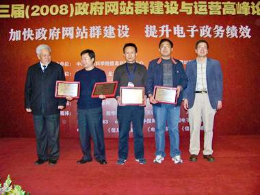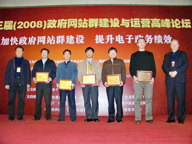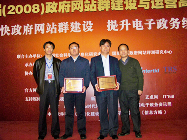 (中國(guó)信息化協(xié)會(huì)副會(huì)長(zhǎng)施鳳海、浙江省駐京辦處長(zhǎng)、電子政務(wù)專(zhuān)家蔣汝忠為獲獎(jiǎng)單位頒獎(jiǎng))