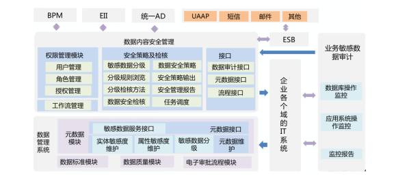 數(shù)據(jù)內(nèi)容安全管理包括對IT系統(tǒng)和數(shù)據(jù)進行敏感度等級劃分的定義、瀏覽、檢核,輔助安全規(guī)則在業(yè)務、技術(shù)領(lǐng)域的應用。從功能上包括數(shù)據(jù)敏感性分級、系統(tǒng)敏感性分級,數(shù)據(jù)安全策略定義管理,安全策略輸出,安全管理報告,數(shù)據(jù)安全檢核,敏感數(shù)據(jù)角色管理,敏感數(shù)據(jù)權(quán)鑒管理及相關(guān)電子審批流程。