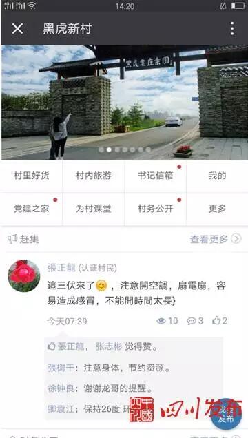 “這還不是最新鮮的?!睆垬淝统鍪謾C(jī),向記者演示黑虎村微信公眾號(hào)?!拔覀冞@個(gè)公眾號(hào)已有1200余人關(guān)注?!睆垬淝н呇菔具吔榻B,這個(gè)公眾號(hào),應(yīng)用政府網(wǎng)站模塊,整合網(wǎng)絡(luò)資源,開(kāi)設(shè)了“美麗黑虎”和“為村平臺(tái)”兩大功能板塊。“美麗黑虎”是政府微門戶集群化建設(shè)的功能載體,與邛崍市人民政府門戶網(wǎng)站手機(jī)版一鍵連通,群眾可以通過(guò)手機(jī)享受到政府門戶網(wǎng)站上所有服務(wù)。