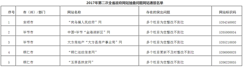 (二)問題整改情況。針對轉載國務院重要信息比例較低的問題,按照網站主管部門自查整改、市(州)政府辦公廳(室)復查、省政府辦公廳抽查的工作思路,各相關單位、部門進行了認真整改。截至目前,貴州省政府門戶網站和10個市級政府門戶網站、88個縣級政府門戶網站100%添加和轉載了“國務院文件”、“國務院信息”、“省政府文件”、“‘我為政府網站找錯’監(jiān)督舉報平臺’”的入口信息。針對被《國務院辦公廳秘書局關于2017年第一季度全國政府網站抽查情況的通報》(國辦秘函〔2017〕14號)通報的“織金教育信息網”,網站主管部門已將該網站申請關停,并將相關信息整合至上級政府網站集中展現。與此同時,織金縣政府辦公室舉一反三,對全縣政府網站進行了全面檢查整改。
