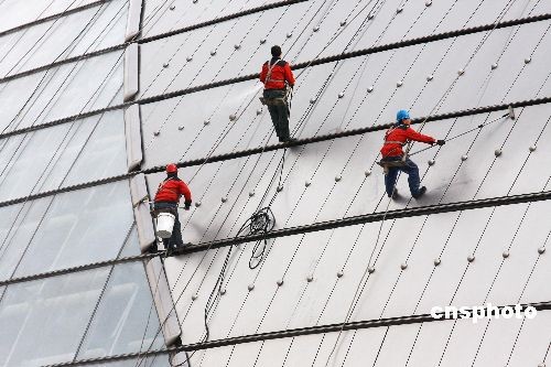 2月23日,幾名“蜘蛛人”保潔人員正在清洗北京國家大劇院外壁及景觀池玻璃上的塵土,使其以靚麗清潔的外觀迎接全國兩會的召開。