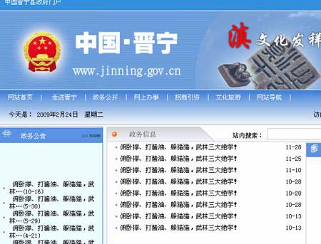 24日晚10時(shí),記者在晉寧縣政府門戶網(wǎng)站(www.jinning.gov.cn)上看到,網(wǎng)站首頁充斥著幾十行“俯臥撐、打醬油、躲貓貓,武林三大絕學(xué)!”的字樣,公示公告、政務(wù)信息、領(lǐng)導(dǎo)講話、政務(wù)文件、政策法規(guī)、統(tǒng)計(jì)數(shù)據(jù)、招商引資、文化旅游等欄目原有的內(nèi)容都被替換成“俯臥撐、打醬油、躲貓貓,武林三大絕學(xué)!”。除了一些圖片無法刪改外,所有的文章標(biāo)題、圖片的注釋也都被改為以上字樣。