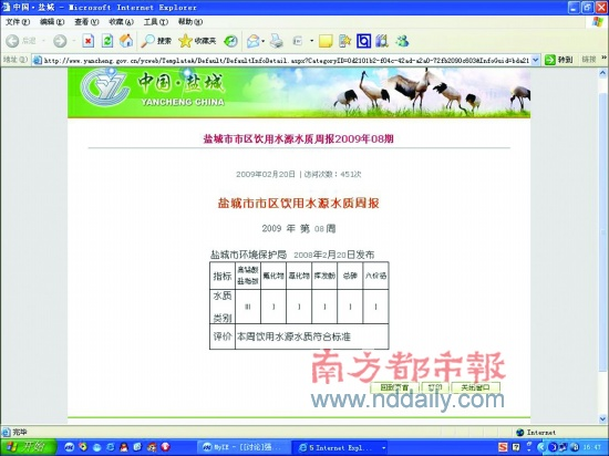2月20日,即鹽城水源污染、全市停水當天,就有網(wǎng)友在鹽城當?shù)卣搲N出了政府網(wǎng)站“中國鹽城”當天公布的2009年第08周《鹽城市市區(qū)水源水質(zhì)周報》(以下簡稱“0908期周報”),這份由鹽城環(huán)保局提供的報告顯示,在第8周的監(jiān)測中,除高錳酸鹽指數(shù)為Ⅲ類外,包括氟化物、氯化物、揮發(fā)酚、總砷、六價鉻在內(nèi)的其他五項監(jiān)控指標均為I類,結論是“本周飲用水源水質(zhì)符合標準”。