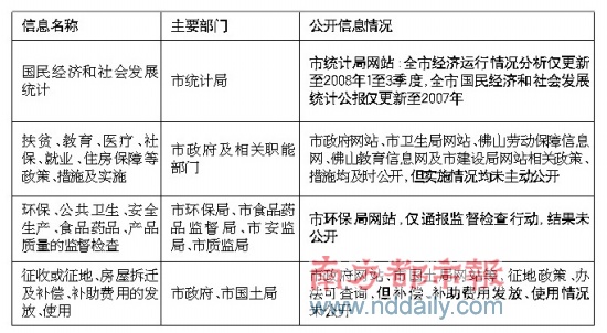 記者對佛山各行政機(jī)關(guān)網(wǎng)站應(yīng)公開信息進(jìn)行盤點(diǎn)(截止時(shí)間:2009年4月6日),發(fā)現(xiàn)信息法規(guī)、規(guī)章、政策、工作報(bào)告等信息的公開相對及時(shí)、公開程度較高,但部分政策實(shí)施情況的公開遠(yuǎn)非完善(見下表)。