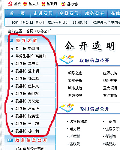 4月23日,網(wǎng)民“冷劍如霜”在論壇的帖文說,“進(jìn)入中國石門政府網(wǎng)站,赫然發(fā)現(xiàn),該縣人民政府領(lǐng)導(dǎo)班子成員配置竟是一正十一副”。他還貼出了石門縣政府網(wǎng)站所列的領(lǐng)導(dǎo)班子的截圖和各領(lǐng)導(dǎo)具體分工。24日,記者登錄石門政府網(wǎng),在“政務(wù)公開”欄目下,看到該縣領(lǐng)導(dǎo)為縣長1名,常務(wù)副縣長1名,副縣長10名。在該欄目下的子欄目“領(lǐng)導(dǎo)之窗”中,記者又看到縣委常委的名單,共計(jì)16人。