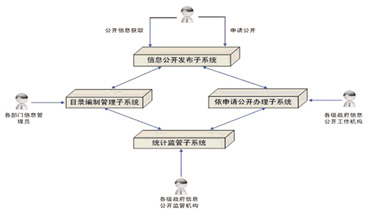 平臺(tái)采用了集中數(shù)據(jù)、個(gè)性表現(xiàn)和分散受理的建設(shè)總原則,市政府門(mén)戶(hù)網(wǎng)站作為總的發(fā)布平臺(tái),各單位網(wǎng)站根據(jù)提供的數(shù)據(jù)接口或嵌入式網(wǎng)頁(yè)作為各單位的發(fā)布平臺(tái)。依申請(qǐng)公開(kāi)和意見(jiàn)箱在市政府網(wǎng)站集中受理,在各單位網(wǎng)站分散受理,后臺(tái)邏輯保持統(tǒng)一。整個(gè)政府信息公開(kāi)平臺(tái)由目錄編制管理、信息公開(kāi)發(fā)布、依申請(qǐng)公開(kāi)辦理、統(tǒng)計(jì)監(jiān)管等4個(gè)大的子系統(tǒng)構(gòu)成。如下圖所示: