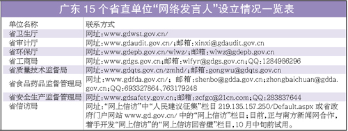 廣東省委辦公廳第二次網友集中反映問題交辦會要求首批設立“網絡發(fā)言人”的l5個省直單位,至昨天已全部設立“網絡發(fā)言人”,并開始履行職責。這標志著廣東在建立網絡發(fā)言人制度上邁出實質性步伐。