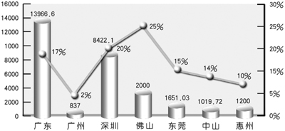 2007年廣東省及部分地市電子信息產(chǎn)業(yè)總產(chǎn)值及同比增長率 單位:億元