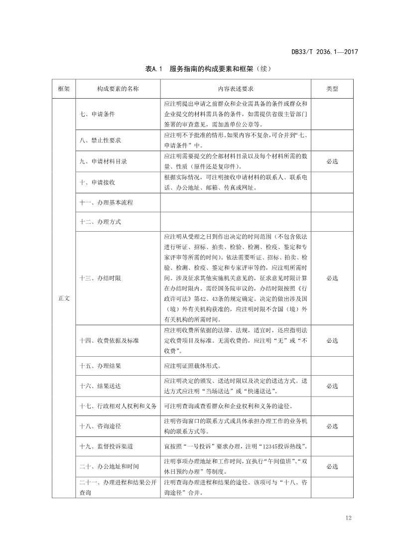 5.8 應(yīng)對每項(xiàng)政務(wù)辦事事項(xiàng)編制服務(wù)指南完整版和簡版,服務(wù)窗口可僅提供簡版,同時(shí)應(yīng)注明完整版的查詢途徑和獲取方式,見規(guī)范性附錄 A。