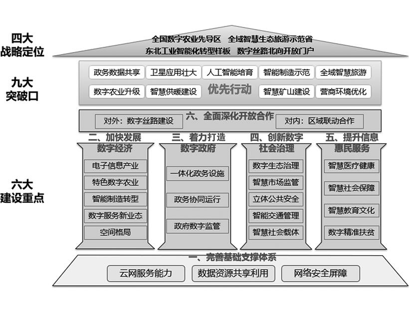 以東北工業(yè)智能化轉(zhuǎn)型樣板、全國數(shù)字農(nóng)業(yè)先導(dǎo)區(qū)、全域智慧生態(tài)旅游示范省和數(shù)字絲路北向開放門戶四大定位為目標(biāo),以完善基礎(chǔ)支撐體系、加快發(fā)展數(shù)字經(jīng)濟、著力打造數(shù)字政府、創(chuàng)新數(shù)字社會治理、提升信息惠民服務(wù)和全面深化開放合作為六大重點,以政務(wù)數(shù)據(jù)共享、衛(wèi)星應(yīng)用壯大、人工智能培育、智能制造示范、全域智慧旅游、數(shù)字農(nóng)業(yè)升級、智慧供暖建設(shè)、智慧礦山建設(shè)、營商環(huán)境優(yōu)化為九大突破口,形成“469”的“數(shù)字龍江”總體框架。