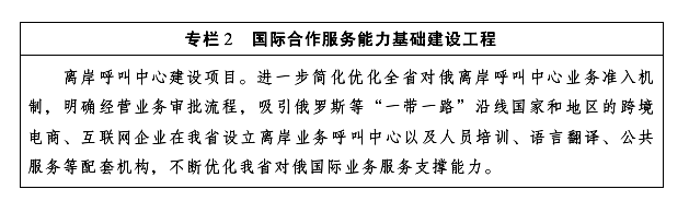 提升國際通信服務(wù)能力。推進對俄對歐跨境通信傳輸網(wǎng)絡(luò)建設(shè)優(yōu)化,適時擴容網(wǎng)絡(luò)承載能力,增強我省對俄開放通信服務(wù)支撐能力。積極爭取國家支持,開通哈爾濱區(qū)域國際互聯(lián)網(wǎng)轉(zhuǎn)接點,提升我省國際互聯(lián)網(wǎng)節(jié)點地位。爭取在我省沿邊開發(fā)開放試驗區(qū)、綜合保稅區(qū)、邊民互市貿(mào)易區(qū)等園區(qū),開設(shè)對俄國際互聯(lián)網(wǎng)數(shù)據(jù)專用通道,提高園區(qū)企業(yè)國際通信服務(wù)質(zhì)量和安全保障能力。發(fā)揮哈爾濱、牡丹江、大慶等服務(wù)外包政策和產(chǎn)業(yè)優(yōu)勢,支持和鼓勵企業(yè)建設(shè)呼叫中心,重點發(fā)展面向通信、金融、先進制造、互聯(lián)網(wǎng)等產(chǎn)業(yè)的語音、在線等客戶服務(wù)業(yè)務(wù)。進一步簡化優(yōu)化離岸呼叫業(yè)務(wù)審批流程,吸引企業(yè)投資設(shè)立離岸呼叫中心,拓展離岸呼叫外包服務(wù),支撐“中蒙俄經(jīng)濟走廊”建設(shè),助力“一帶一路”國際合作。