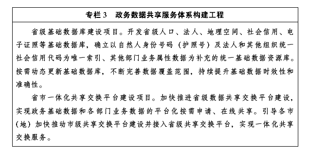 強化一體化數(shù)據(jù)資源整合與共享。加快推進省級政務(wù)基礎(chǔ)數(shù)據(jù)資源體系建設(shè),統(tǒng)籌搭建人口、法人、地理空間、社會信用、電子證照等基礎(chǔ)數(shù)據(jù)庫,協(xié)調(diào)推進自然資源、交通運輸、醫(yī)療衛(wèi)生等重點領(lǐng)域主題數(shù)據(jù)庫建設(shè),強化政務(wù)大數(shù)據(jù)應(yīng)用數(shù)據(jù)資源儲備。推進省兩級一體化政務(wù)共享交換平臺建設(shè)和互聯(lián)互通,打通與國家政務(wù)共享交換平臺和各部門業(yè)務(wù)系統(tǒng)接口,打造跨層級、部門數(shù)據(jù)互聯(lián)互通“大通道”,推動政務(wù)數(shù)據(jù)資源按需申請、順暢流通、高效共享。建立健全軍地信息跨網(wǎng)聯(lián)接和數(shù)據(jù)交換機制,推動測繪地理、氣象、地震、水文、交通運輸、戰(zhàn)略物資儲備等信息安全共享。