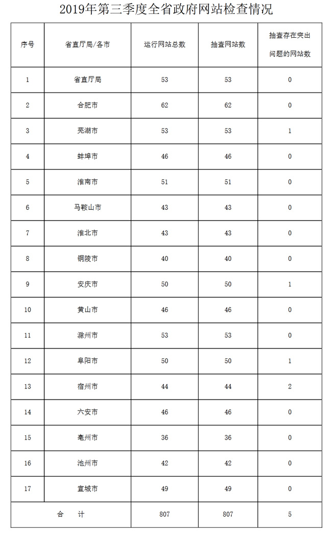截至8月28日,我省在全國政府網(wǎng)站信息報(bào)送系統(tǒng)中備案政府網(wǎng)站807家。其中,省人民政府門戶網(wǎng)站1家,省級政府部門網(wǎng)站及專項(xiàng)網(wǎng)站52家,市、縣級政府門戶網(wǎng)站121家,市級政府部門網(wǎng)站及專項(xiàng)網(wǎng)站633家。本次檢查發(fā)現(xiàn),黃山、阜陽、合肥和淮北市政府門戶網(wǎng)站建設(shè)較好、得分較高。經(jīng)抽樣復(fù)核,各市上報(bào)的政府網(wǎng)站和政務(wù)新媒體日常監(jiān)測結(jié)果整體真實(shí)準(zhǔn)確。