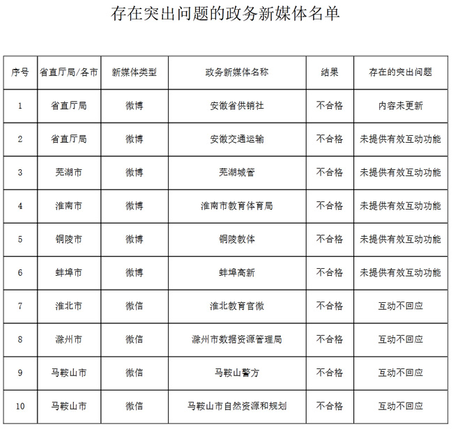 一些政務(wù)微信日常運(yùn)維檢查力度不夠,微信菜單鏈接無法訪問。上季度通報(bào)“安徽省供銷社”微博內(nèi)容更新不及時(shí)問題,至今仍未整改到位?!鞍不战煌ㄟ\(yùn)輸”“蕪湖城管”“淮南市教育體育局”“銅陵教體”“蚌埠高新”微博關(guān)閉網(wǎng)民留言評論渠道,其中“蚌埠高新”微博發(fā)布內(nèi)容多為轉(zhuǎn)發(fā)內(nèi)容,缺少本單位政務(wù)信息?!盎幢苯逃傥ⅰ薄俺菔袛?shù)據(jù)資源管理局”“馬鞍山警方”“馬鞍山市自然資源和規(guī)劃”微信未及時(shí)辦理網(wǎng)民留言、回應(yīng)群眾關(guān)切。