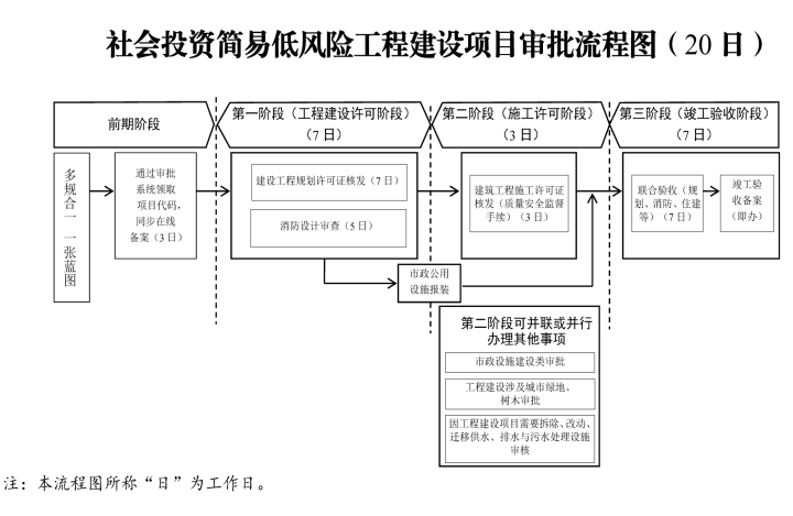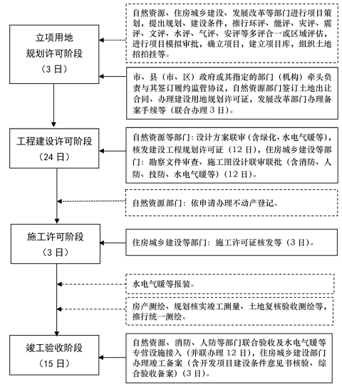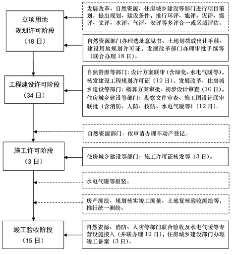 注: 1. 圖中虛線(xiàn)部分表示由政府部門(mén)、單位提前介入事項(xiàng),有關(guān)部門(mén)、單位并行辦理但不計(jì)入主流程審批(審查)時(shí)間的事項(xiàng)。建設(shè)單位按要求整改時(shí)間,不計(jì)入審批時(shí)間。