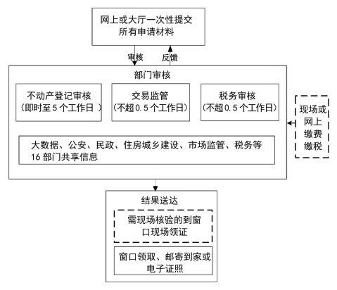 不動(dòng)產(chǎn)登記機(jī)構(gòu)按照國(guó)家有關(guān)規(guī)定,加強(qiáng)部門(mén)協(xié)作,實(shí)行不動(dòng)產(chǎn)登記、交易和繳稅一窗受理、并行辦理,壓縮辦理時(shí)間,降低辦理成本。推進(jìn)網(wǎng)上繳稅或委托不動(dòng)產(chǎn)登記機(jī)構(gòu)代為辦理收繳稅款,進(jìn)一步減少環(huán)節(jié)。